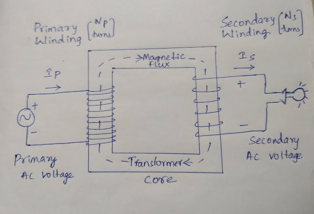 . An alternating current passes through primary coil wrapped around soft iron core.